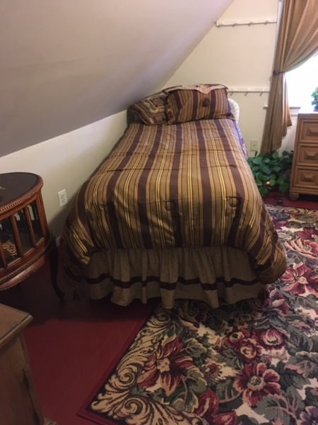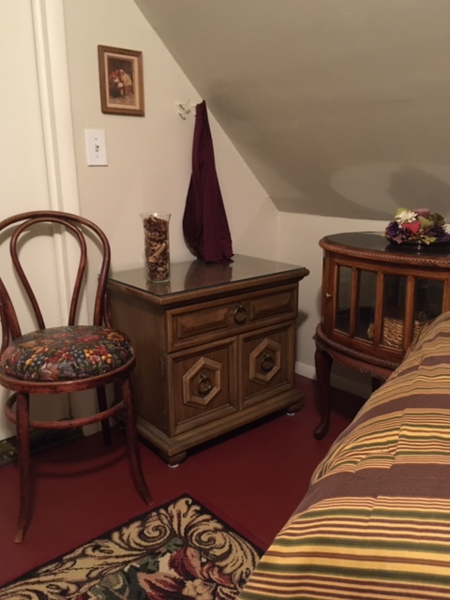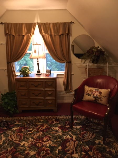 The Small Study is a quiet repose for the short stay. Perfect for medical students, this room is dominated by a bright window, with a twin bed, two dressers, computer work desk, TV, clothing rack, pegs and a valet. It has an adjacent sitting room with cozy chairs. The Study is on the second floor. Located on the first floor is a private full bath with a shower and jaccuzi tub. Guests have use of the kitchen, foyer, dinning room, family room, laundry room, deck, yard and gardens.